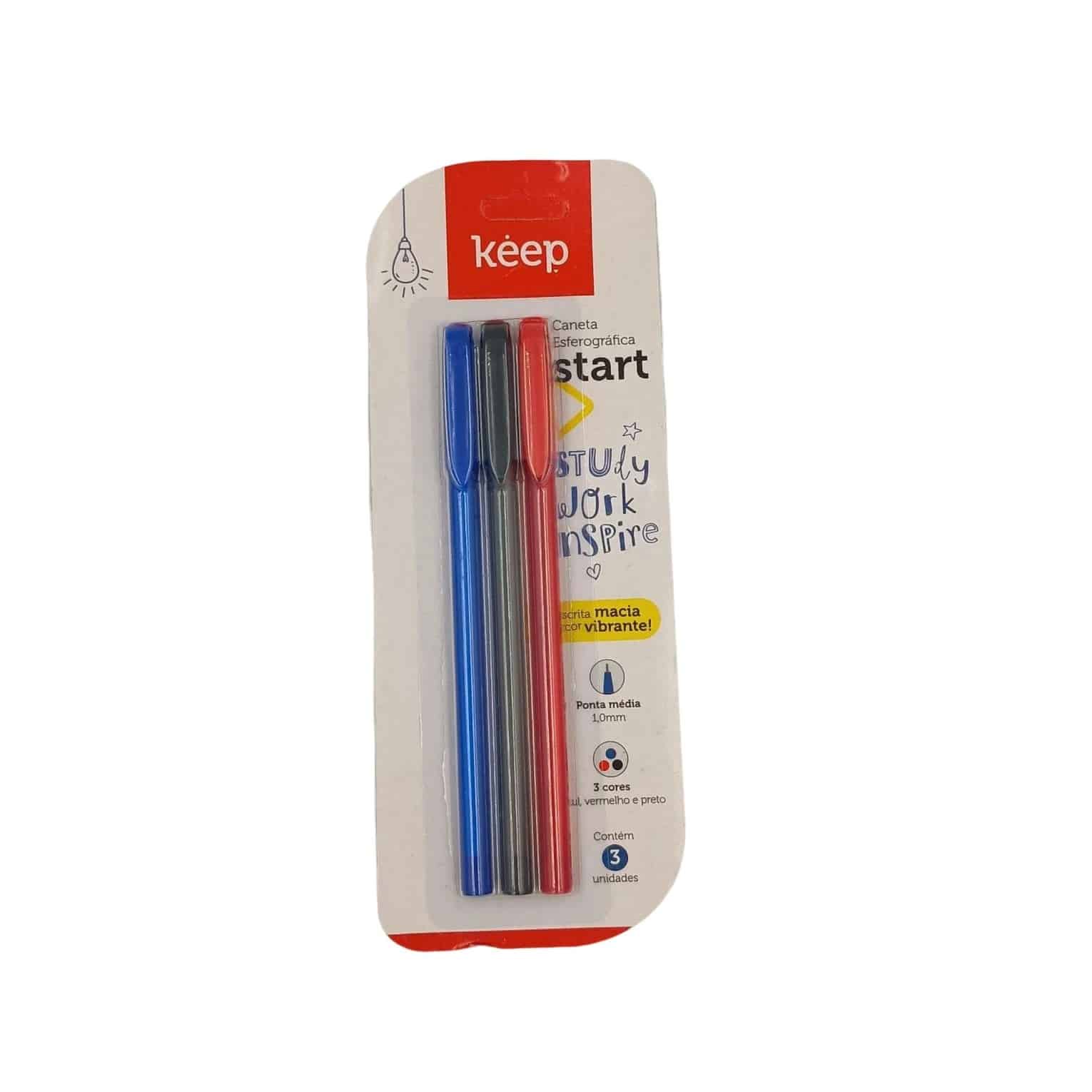 Kit Caneta Esferográfica Keep Start – 3 Cores (Azul, Vermelha e Preta)