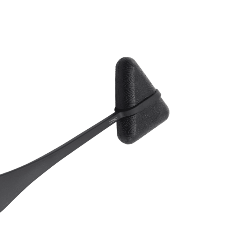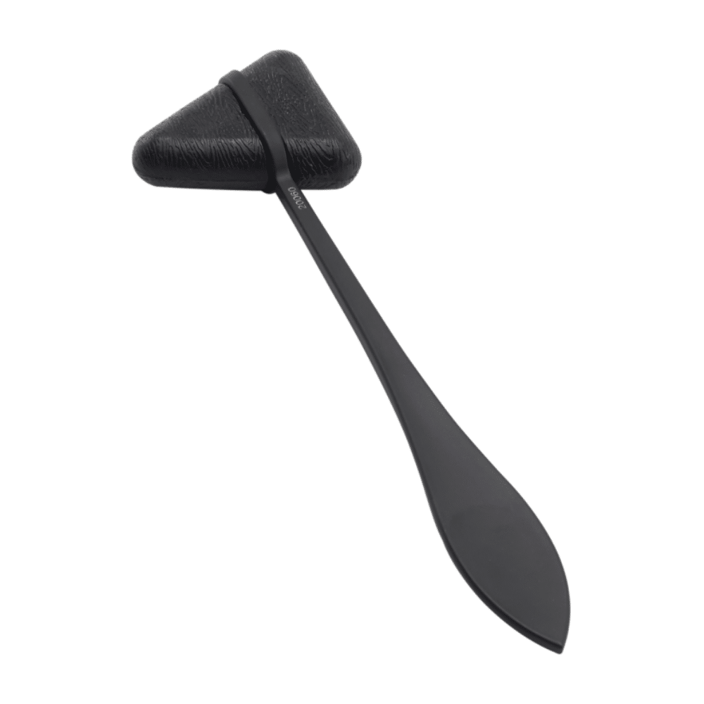 Possui cabeça triangular em borracha sintética que oferece impacto controlado, garantindo segurança e conforto durante o exame. Seu cabo metálico em acabamento preto fosco proporciona equilíbrio perfeito, aderência firme e um toque moderno ao consultório.